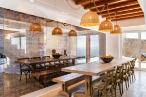Ένα λάκκο με φωτιά 70 τετραγωνικών μέτρων και καθιστικό όπου όλοι μπορούν να απολαύσουν το ηλιοβασίλεμα και τη θέα στο Αιγαίο Πέλαγος, πάνω από μια φωτιά. Ο χώρος της πισίνας/τζακούζι διαθέτει ξαπλώστρες, ντους, πέργκολα, χτιστούς καναπέδες και τραπεζαρία. Μπορεί να φιλοξενήσει ιδιωτικές λειτουργίες κατόπιν αιτήματος.